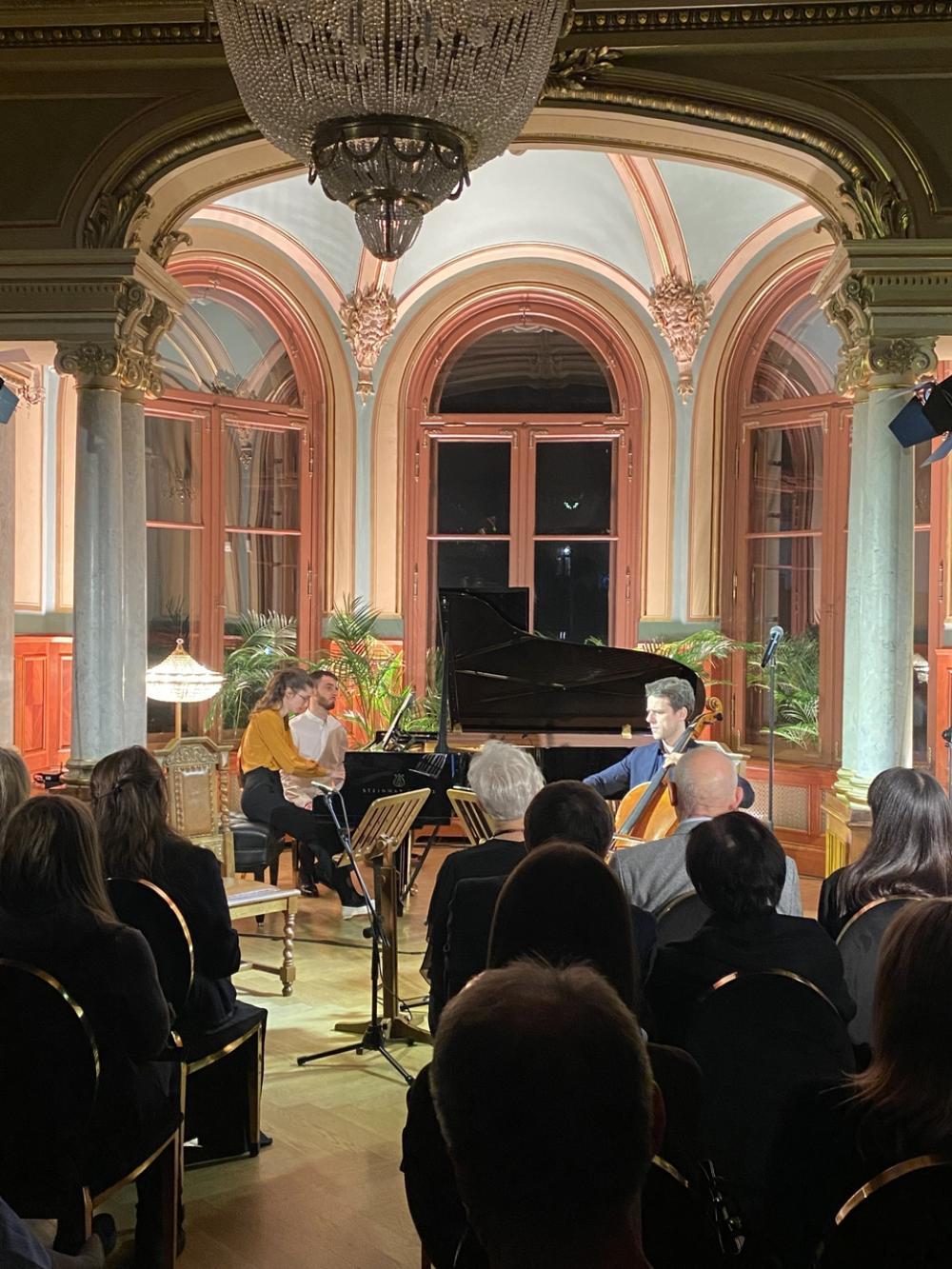 W sobotę (23 listopada) w Willi Lentza odbył się kolejny koncert organizowany w ramach cyklu prezentującego wszystkie dzieła najwybitniejszego polskiego kompozytora i pianisty. Tym razem francuscy muzycy z PAVONE ENSEMBLE (skrzypek Elie Hackel, wiolonczelista Thibaut Reznicek oraz pianistka Sarah Zajtmann), przedstawili wybrane pieśni Fryderyka Chopina oraz Jego utwory kameralne na skrzypce, wiolonczelę i fortepian.