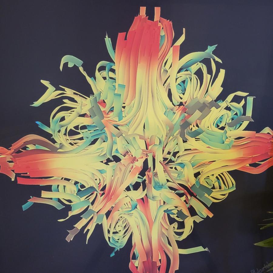 Rzeźba Ryszarda Wilka. Praca artysty złożona z wielu elementów o module cegły, z płaskorzeźbą oraz z dynamicznymi śladami wcięć o zróżnicowanych żłobieniach, ilustruje świat impresyjny o silnej dynamice kierunków i światła odbitego od zeszkliwionej powierzchni ceramiki. Wielobarwne dzieło (od zieleni, poprzez brązy do fioletu) uwypukla bogatą grę iluzoryczną form, a natężenie światła i refleks szkliwa tworzą różnorodność kolorystyczną.